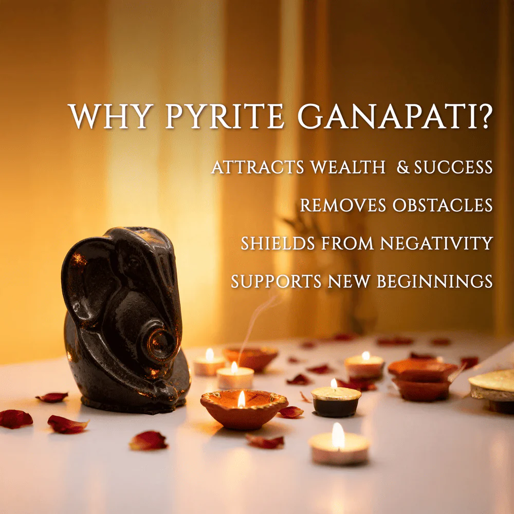 Pyrite represents manifestation, confidence, and abundance, while Ganesha symbolizes wisdom and success.